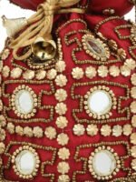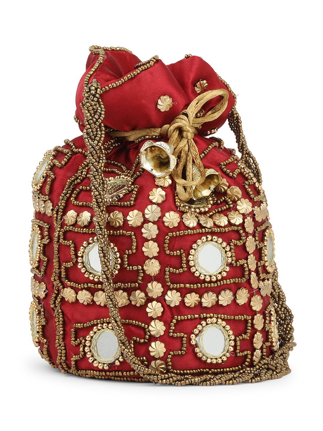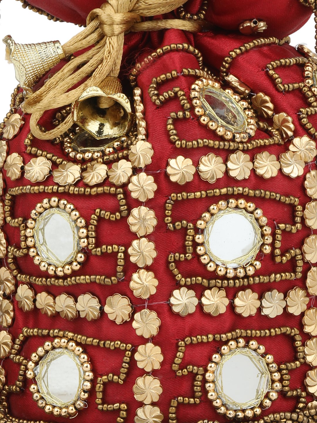 Maroon embellished potli Has wrist loop 1 main compartment with drawstring closure Size & Fit Size : 9 x 9 x 3 Inch (Length x Width x Depth ) Material & Care Fabric Wipe with clean, dry cloth
