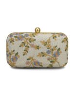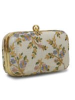 White & Gold Embroidered Clutch 1 Main compartment with click closure has detachable shoulder strap