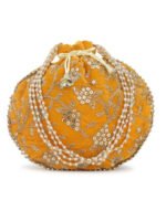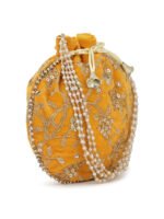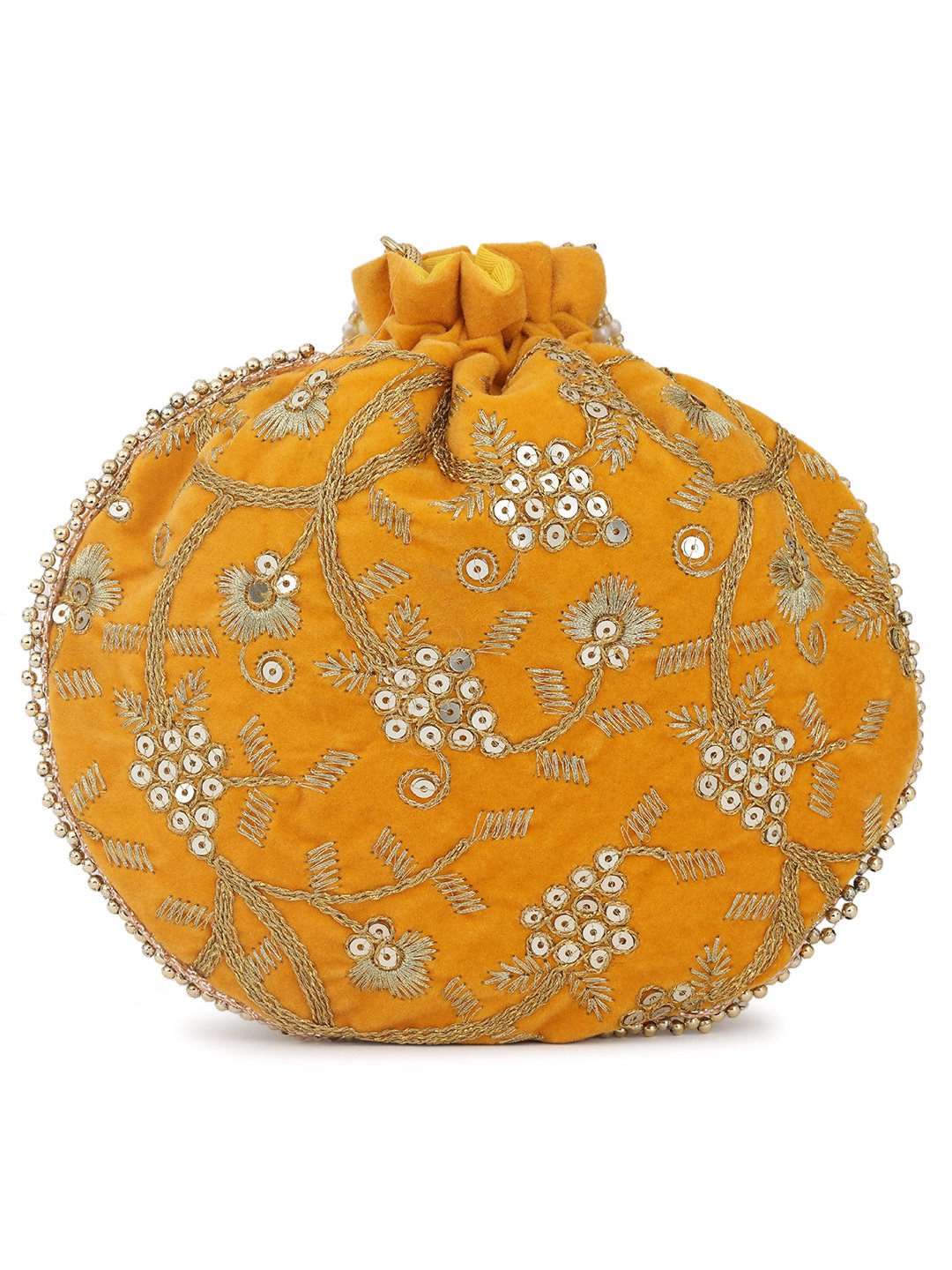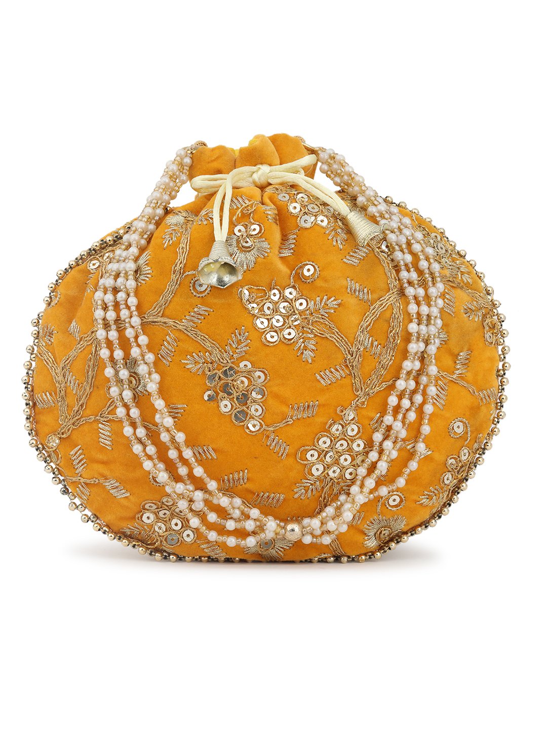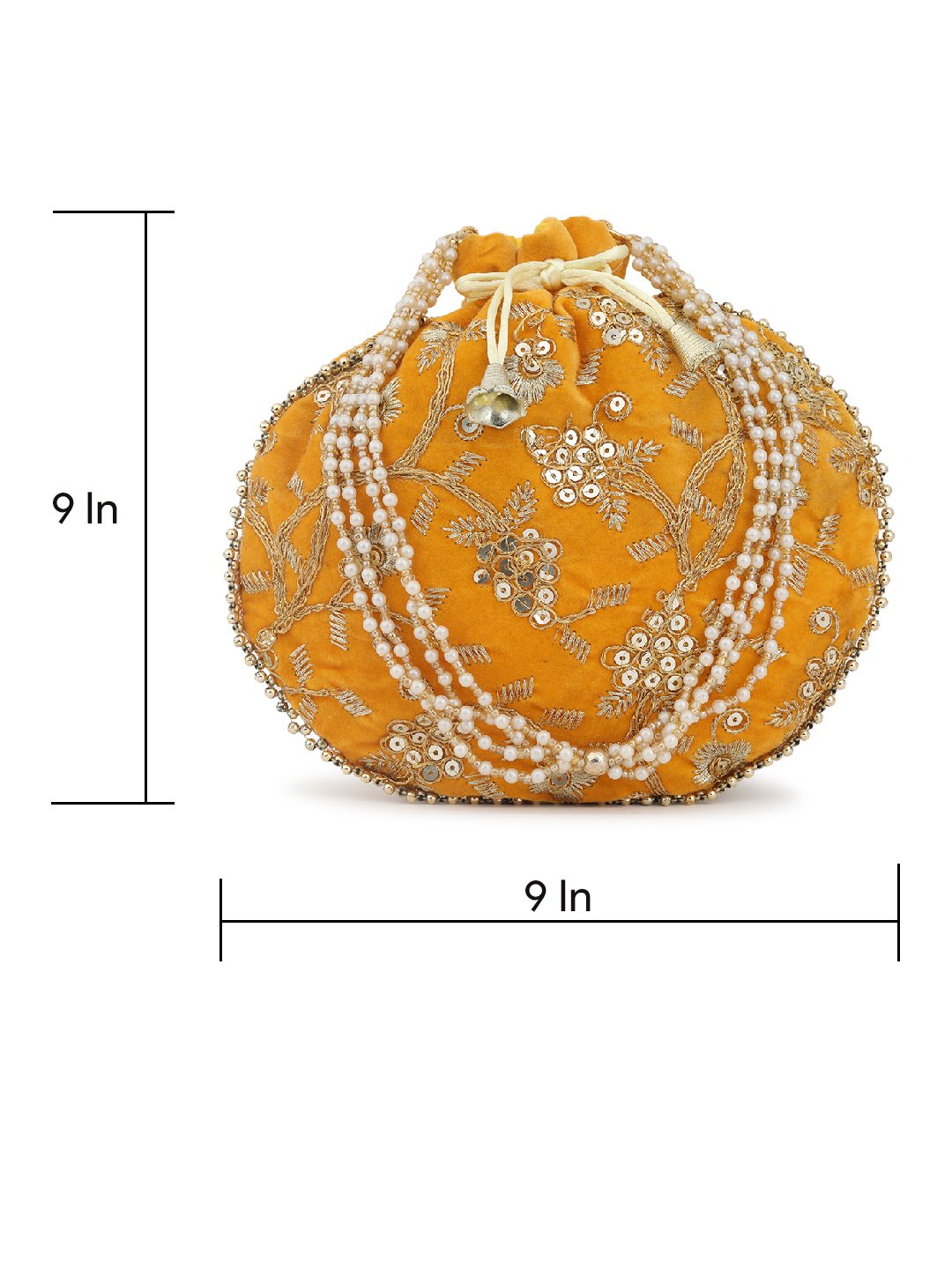 Yellow embroidered potli clutches Has wrist loop 1 main compartment with drawstring closure Size & Fit Height: 9 cm Width: 3 cm Depth: 9 cm Material & Care Fabric Wipe with a clean, dry cloth when needed