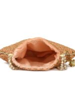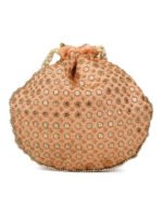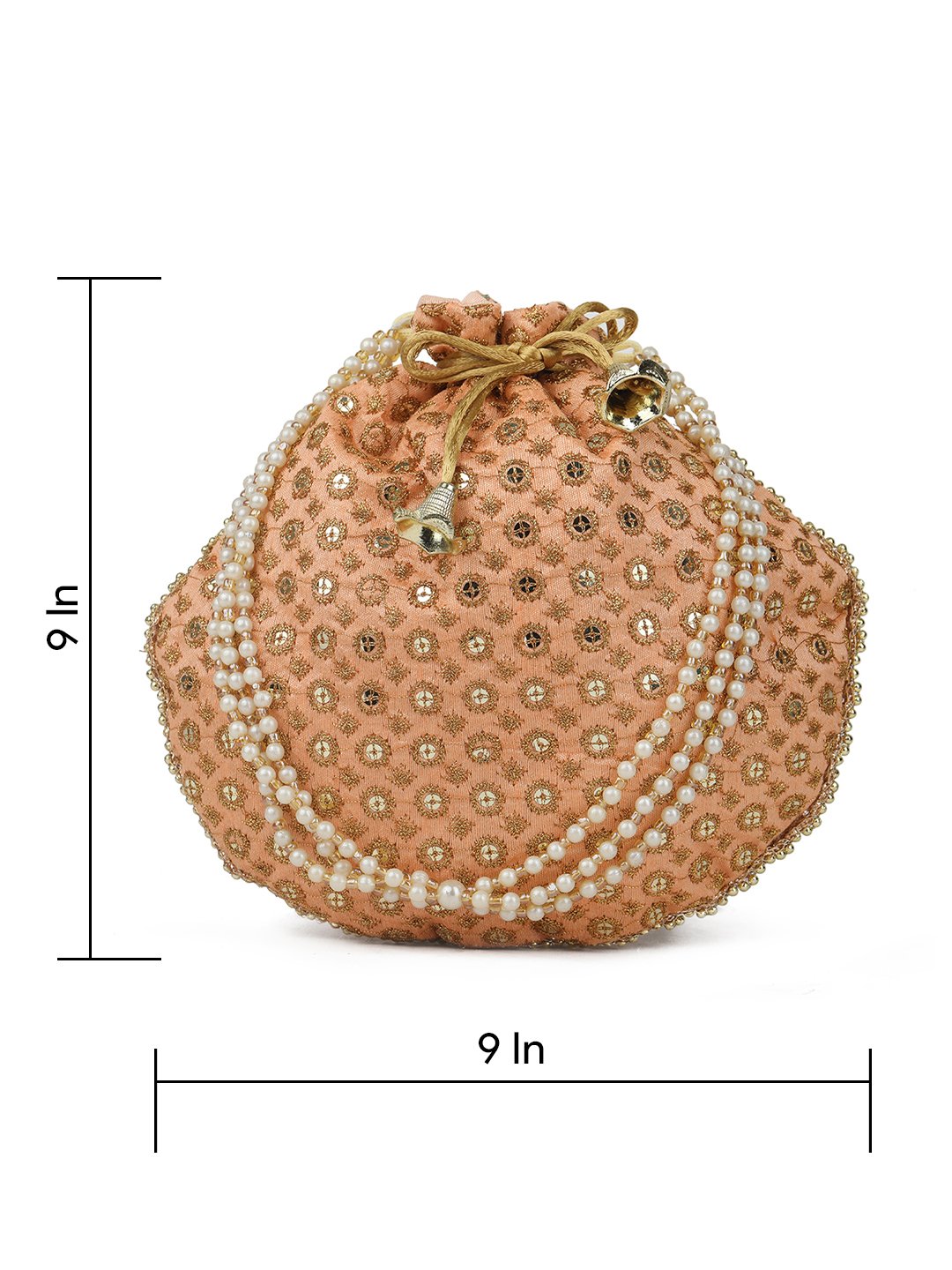 Beige embellished potli Has wrist loop 1 main compartment with drawstring closure Size & Fit Size : 9 x 9 x 3 Inch (Length x Width x Depth ) Material & Care Fabric Wipe with clean, dry cloth